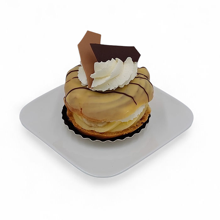 Luchtige soes gevuld met Zwitserse room, plakjes banaan en slagroom en overgoten met bananen chocolade