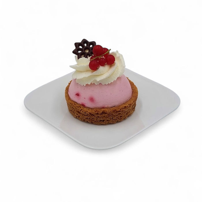 Biscuit gevuld met kersenbavarois op een bodem van harde wenerdeeg met een laagje chocolade
