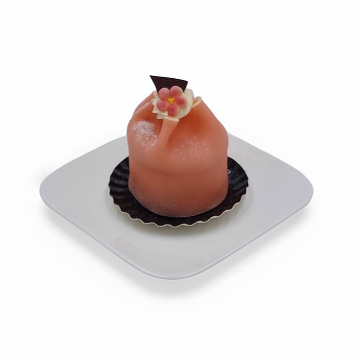 moscovische cake gevuld met een combinatie van luchtige vanille creme en frambozen bessenjam en afgewerkt met roze marsepein