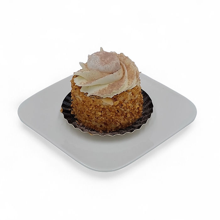 Hazelnootschuim gevuld met luchtige vanille creme, afgespoten met romige slagroom, aangezet met een krokantje van hazelnoot en afgewerkt met een huisgemaakt schuimpje